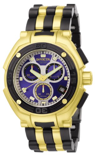Stainless steel case with a black rubber and gold-tone stainless steel bracelet. Fixed gold-tone polyurethane with diver's scale bezel. Blue dial with luminous hands and index hour markers. Minute markers around the outer rim. Luminiscent hands and dial markers. Date display appears at the 4 o'clock position. Three - 60 seconds, 30 minutes and 1/10th of a second. Swiss quartz chronograph g10.211 movement. Scratch resistant flame fusion crystal. Push / pull with function pushers crown. Case diameter: 50 mm. Fold over with safety release clasp. Water resistant at 100 meters / 330 feet. Functions: hours, minutes, second, date, chronograph. Invicta Mens Speedway Swiss Chronograph Blue Dial Bracelet Watch 6272.